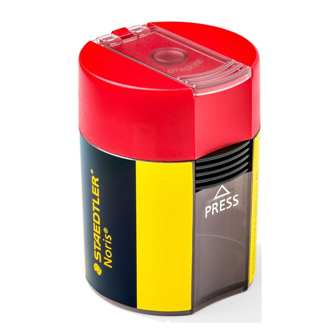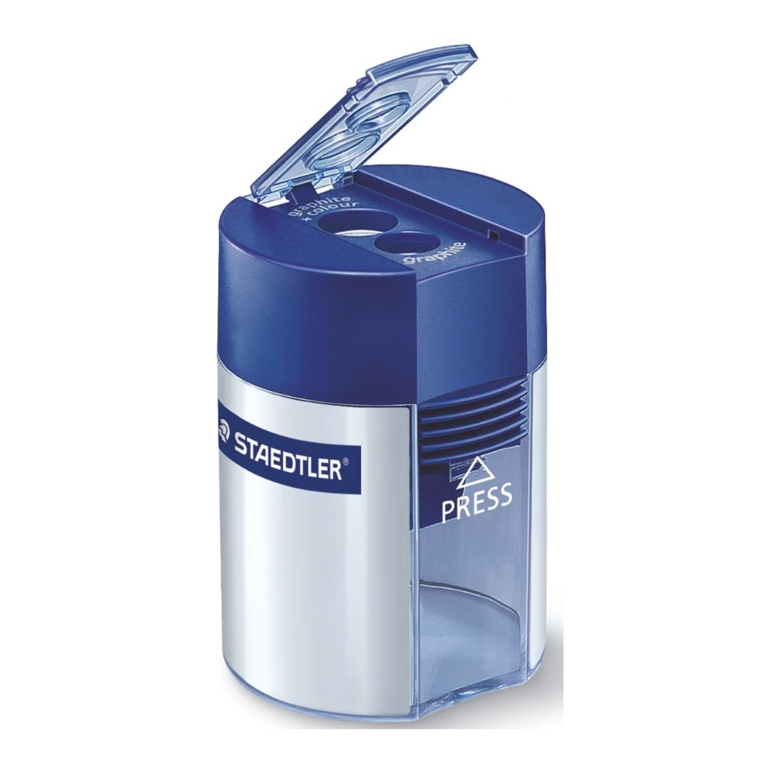 Temperamatite con portatrucioli rotondo, in plastica., per diversi tipi di matita. Interno in metallo con fissaggio della lama in 3 punti per una migliore stabilità. Lama in acciaio a lunga durata. Miglior risultato di affilatura grazie alla lunga guida per l'inserimento della matita. Coperchio con chiusura a pressione, contro aperture accidentali.